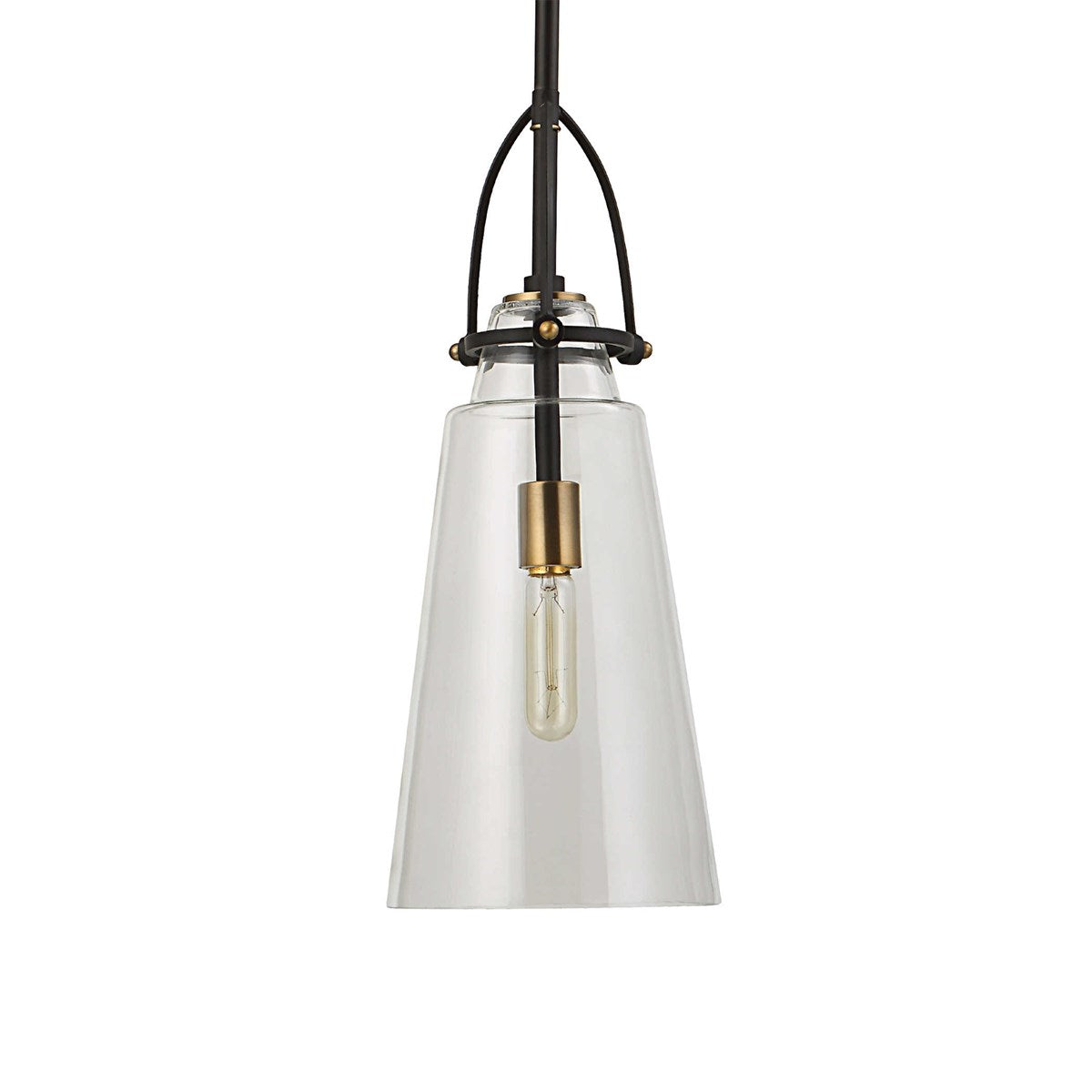 This timeless 1-light Saugus Mini Pendant is finished in black with antique brass accents and features a clear glass shade. Use a decorative 60 watt Editon bulb to add a touch of rustic & industrial design. With 15 feet of wire and an adjustable stem, you can use the Saugus Mini Pendant as a single task-light over a kitchen sink or in multiples to accent an island or double vanity.