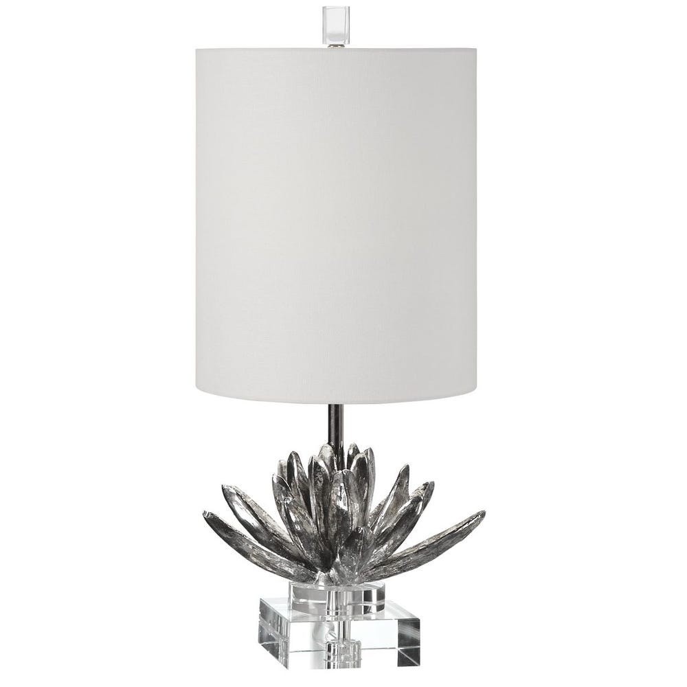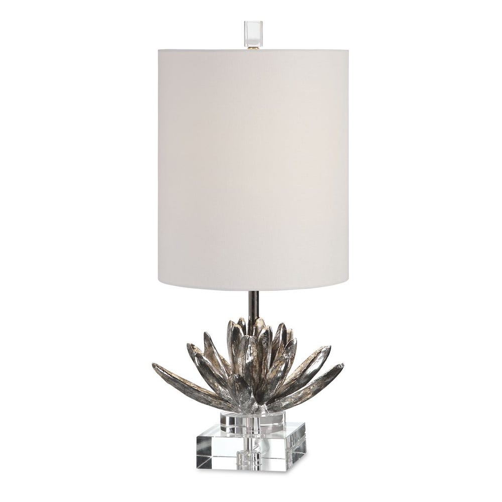 Simple elegance is achieved by the Silver Lotus Accent Lamp with an antiqued, metallic silver, lotus bloom that appears to be floating on a clear crystal foot. The round hardback drum shade is a white linen fabric with natural slubbing.