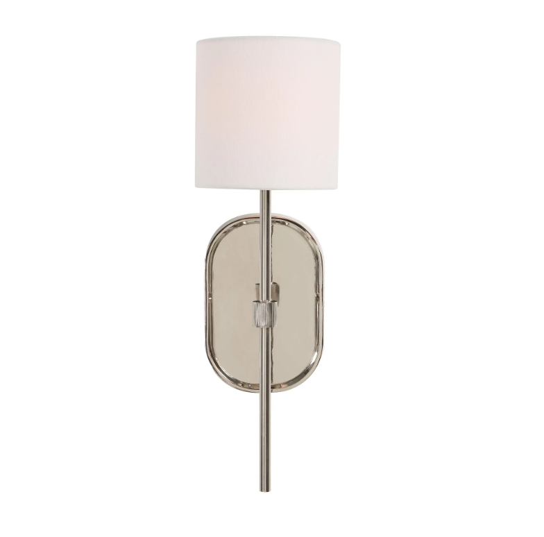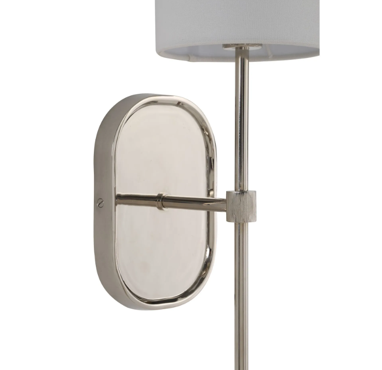 Combining sleek polished nickel-plated forged aluminum and pure ivory linen, incorporate this handsome wall sconce in your decorating scheme to deliver transitional charm and warm, ambient light at the flick of a switch. Displayed on its own, it makes a statement of great taste that gets exponentially stronger when paired up or featured in multiples.