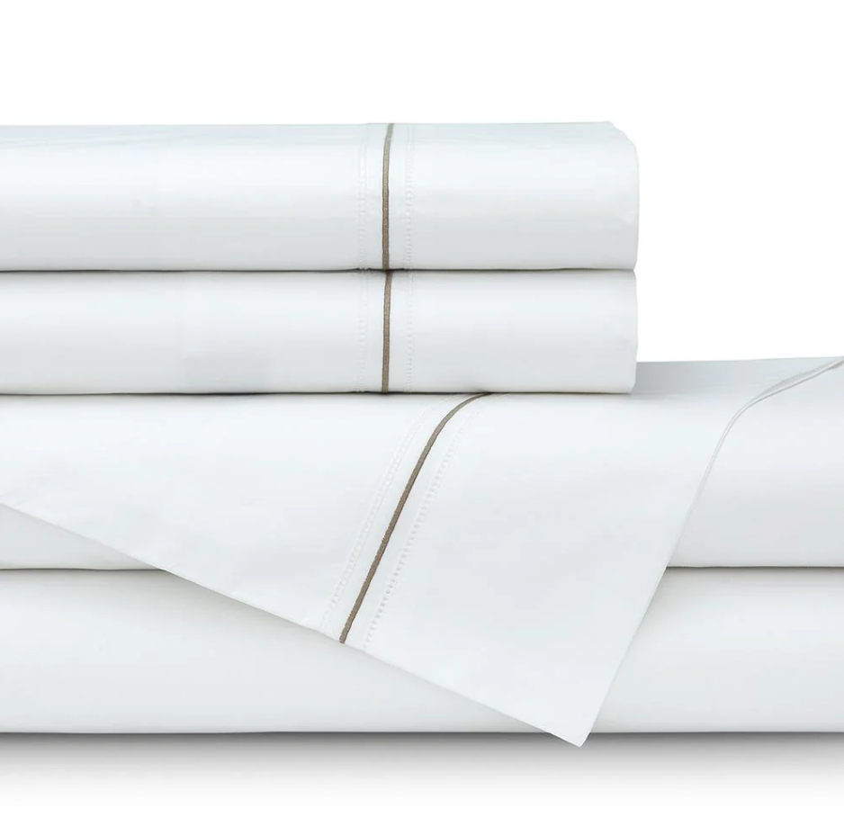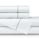 Bella White 300CT Sheet Set has a double hemstitch in white cotton percale with a satin piping embroidery. Includes one flat sheet, one 18" deep fitted sheet, and two pillowcases.