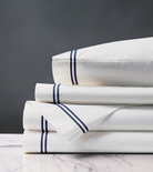 Experience luxurious comfort with the Enzo Satin Sheet Set with 2 rows of Navy stitch cuff. Made from 100% Egyptian cotton with a 200 thread count, these breathable sheets provide a crisp, restful sleep. The set includes a flat sheet, fitted sheet with deep 17-inch pockets, and pillowcases, all detailed with elegant satin stitching. Easy to care for, machine washable and designed to fit securely on deep mattresses. Elevate your bedding with this stylish and comfortable set.