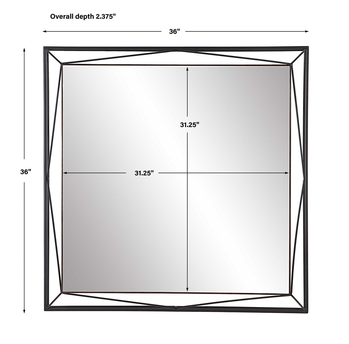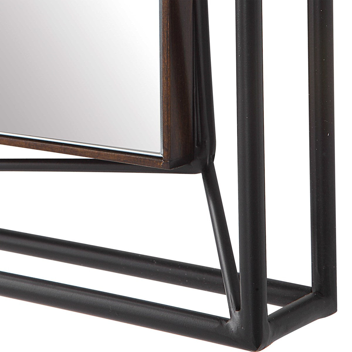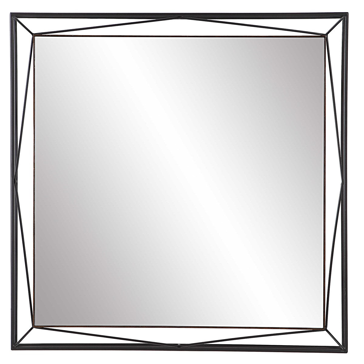 Inspired by contemporary designs, the suspended "Entangled" square mirror is accented by a 3-dimensional angular metal frame in satin black with a petite pond cypress wood frame surrounding the mirror giving this mirror a modern industrial feel.