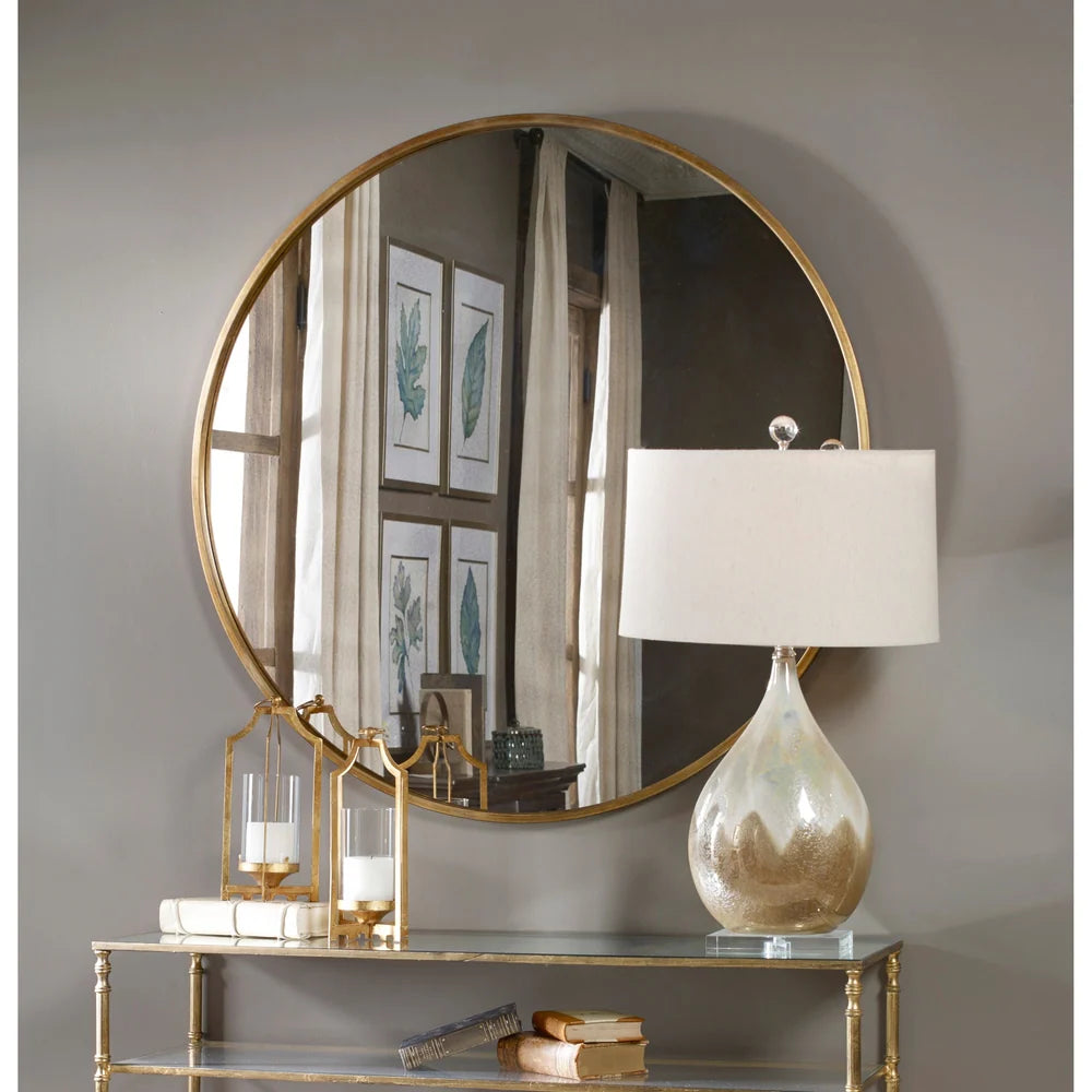 The classic contemporary feel of the 43 inch Junius Round Wall Mirror includes a narrow metal frame finished in a heavily antiqued gold leaf finish surrounding an antiqued mirror. It's a subtle but sophisticated accent that adds charm and character to any room it graces.