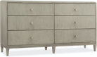 The Elixir Six-Drawer Dresser features crisp lines and gray beige finish to lightly sand-blasted walnut veneer. Faux shagreen knobs and a red drop-in felt liner are included in the top drawers, while bottom drawers have cedar lining. It is part of the casual contemporary Elixir collection, achieving character and texture through sand-blasted veneer, light metal elements and hand-carved surface. The buffet offers a starburst pattern on the doors.