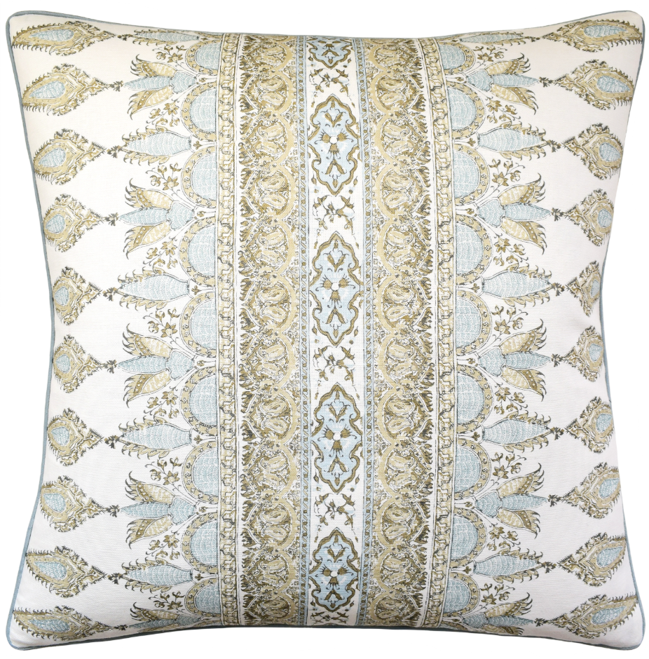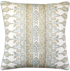 The Akola Beige Stripe Pillows are inspired by an antique palampore design, reimagined; the border is mirror to create a large-scale stripe. The intricate, multicolored pattern makes a statement, whether used as a graphic focal point. Made with luxurious Thibaut Fabric. Sits beautifully with solids, mini-prints, other tribal patterns. The convenient zipper closure allows for easy cover removal when cleaning is needed. Includes a premium down/feather insert. Available in standard and custom sizes.