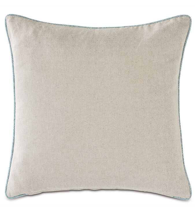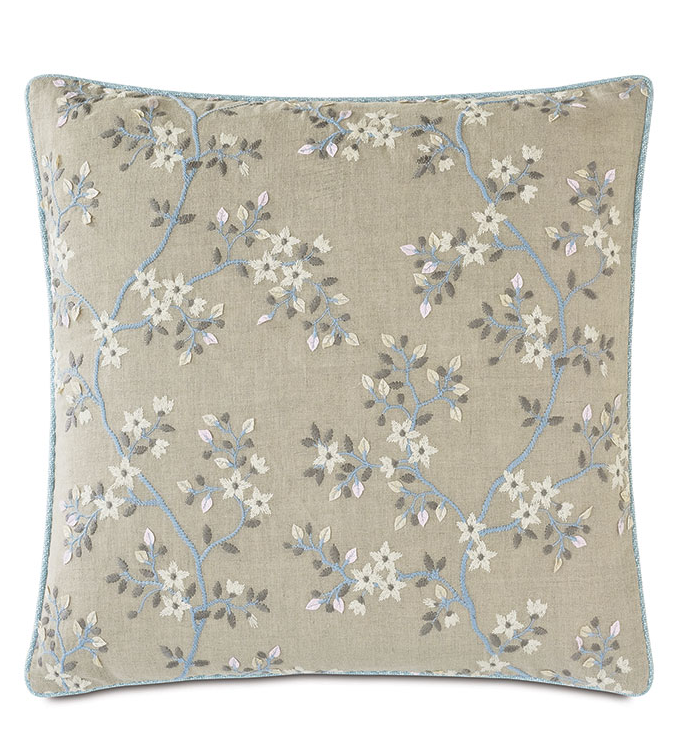 This decorative pillow features a delicate floral embroidery on a soft linen-blend fabric, bringing texture and elegance to any space. The reverse is finished in Greer Linen for a subtle, neutral contrast. A refined small welt edge adds a tailored touch, while a hidden zipper ensures easy care.