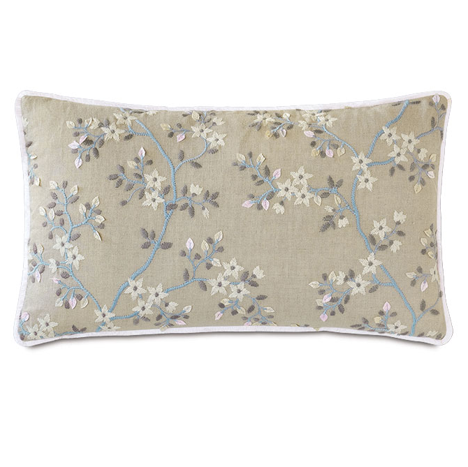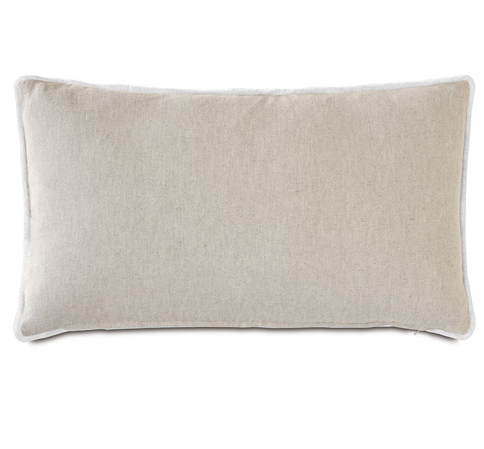 This elegant pillow features a beautiful embroidered floral design on a soft linen blend. It reverses to a simple Greer Linen side with a delicate mini fringe edge. Comes with your choice of insert and a zipper cover for easy cleaning. Perfect to add a refined, natural touch to any room.