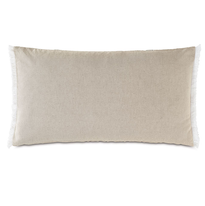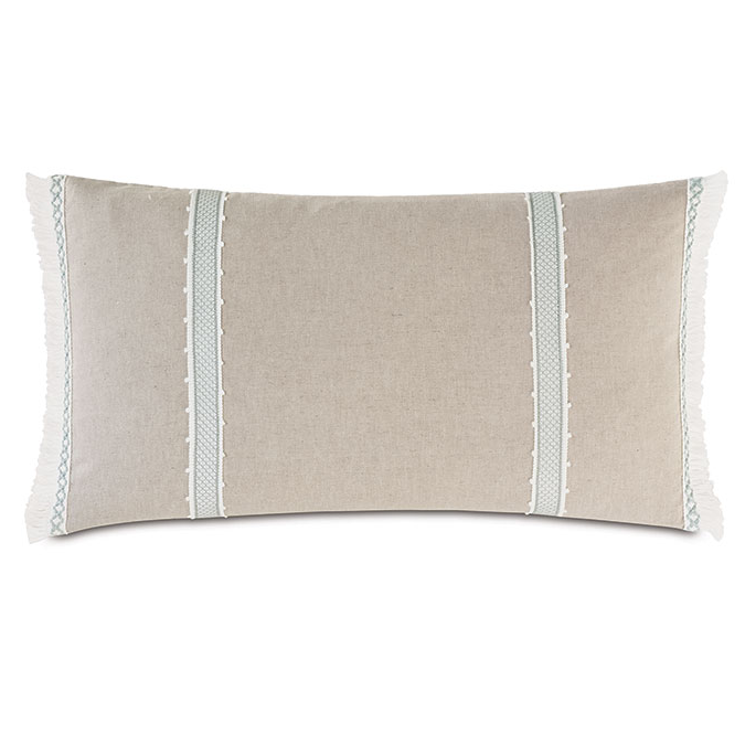 This decorative pillow features elegant ribbon details on a soft beige fabric and reverses to a subtle Greer Linen for versatile style. Finished with a charming fringe edge, it includes a zipper cover for easy cleaning.