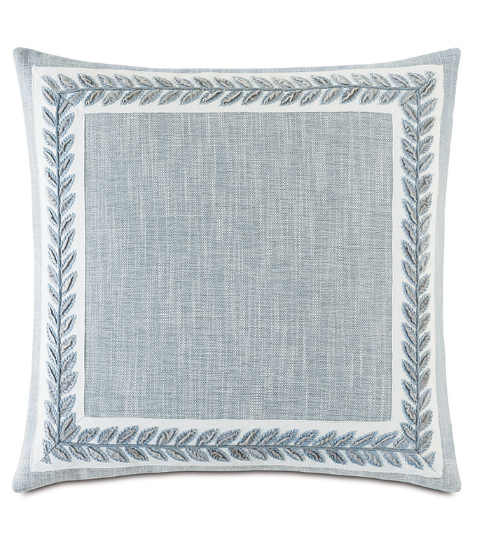 This decorative pillow features an elegant embroidered border and a crisp knife-edge finish. It's self-backed in Holton Sky and includes your choice of insert for instant style. Complete with a zipper closure for easy care.