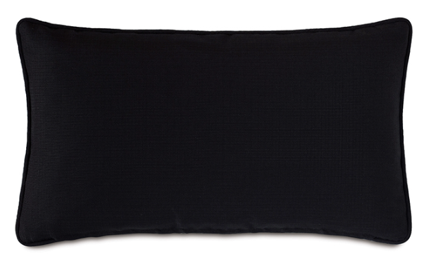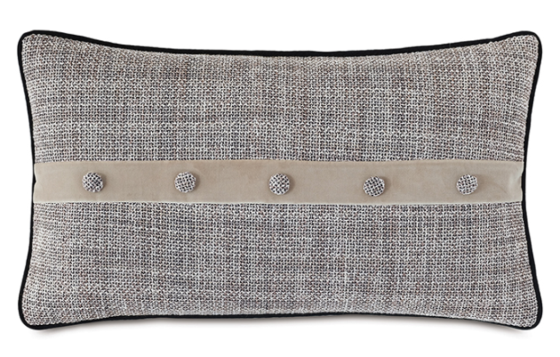 This decorative pillow features a textured taupe fabric with a unique border and button detail. It reverses to a bold black side for versatile looks and includes a zipper for easy cleaning. Your choice of insert is included, with custom options available to suit your style.