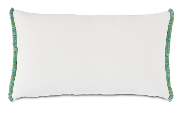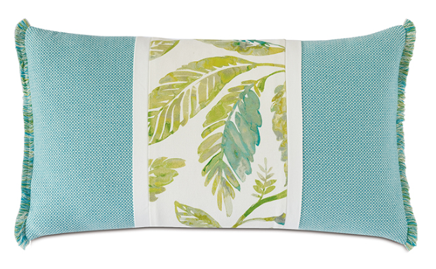 This decorative pillow features a refreshing aqua blue pin check fabric with a botanical leaf print insert. It reverses to crisp white cotton for versatile styling and is trimmed with soft brush fringe. Includes your choice of insert and a zipper closure for easy cleaning.