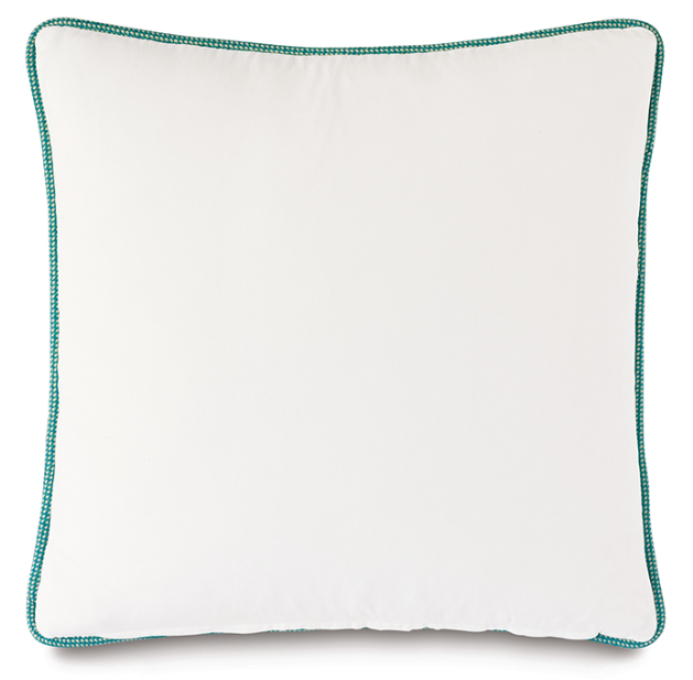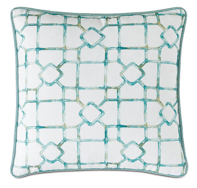 This pillow features a calming aqua blue bamboo trellis design on one side and a clean Essex White on the other, adding natural elegance to any room. It includes your choice of insert and a zipper closure for easy care.