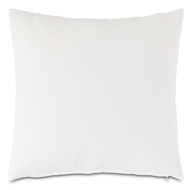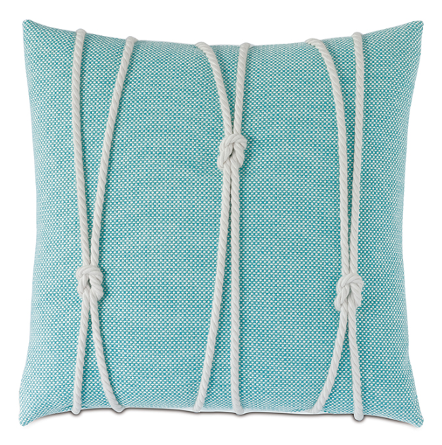 This decorative pillow features hand-tied nautical knots on aqua blue pin check fabric, adding a coastal charm. It reverses to crisp white cotton for versatile style and includes your choice of insert with a zipper closure for easy care.