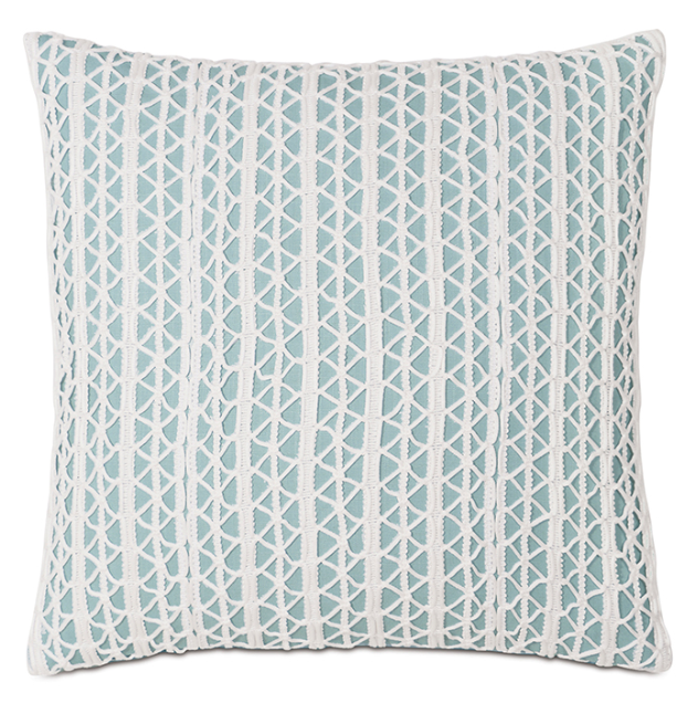 This decorative pillow combines a white textured trellis trim with rich blue fabric for a stylish look. It’s self-backed in Baba Blue with a clean knife edge finish. Includes your choice of insert and a zipper closure for easy cleaning.