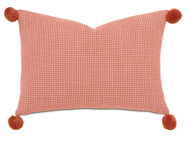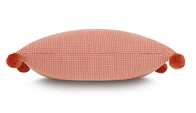 Add a bright touch to your room with this pillow in coral crosshatch fabric. It has a smooth Bula Guava back, pom-pom corners, and a neat cord edge. Choose from three soft inserts for comfort, and an invisible zipper makes cleaning simple.