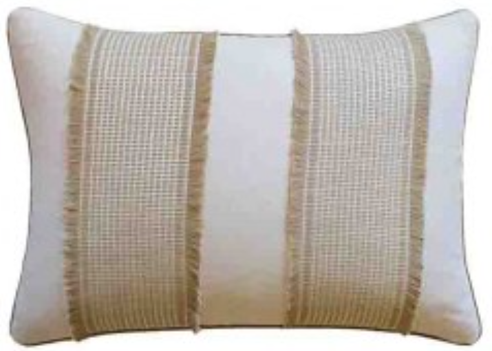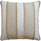 Tulum Natural Throw Pillows have a wide woven textural stripe of Schumacher "eyelash fringed" fabric in a classic Khaki that sits on a crisp white base. Finished with contrast piping and backed in a complimenting solid. Tulum is the perfect Neutral Pillow. Available in two standard sizes and available in additional sizes by custom order.