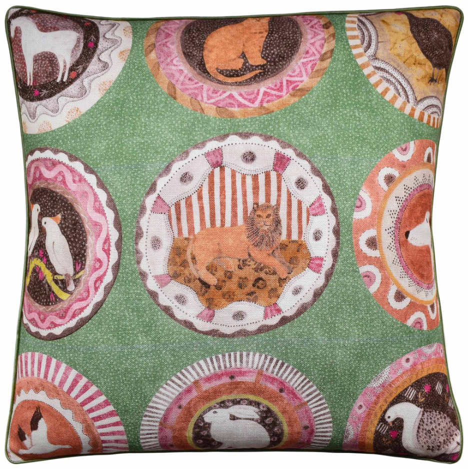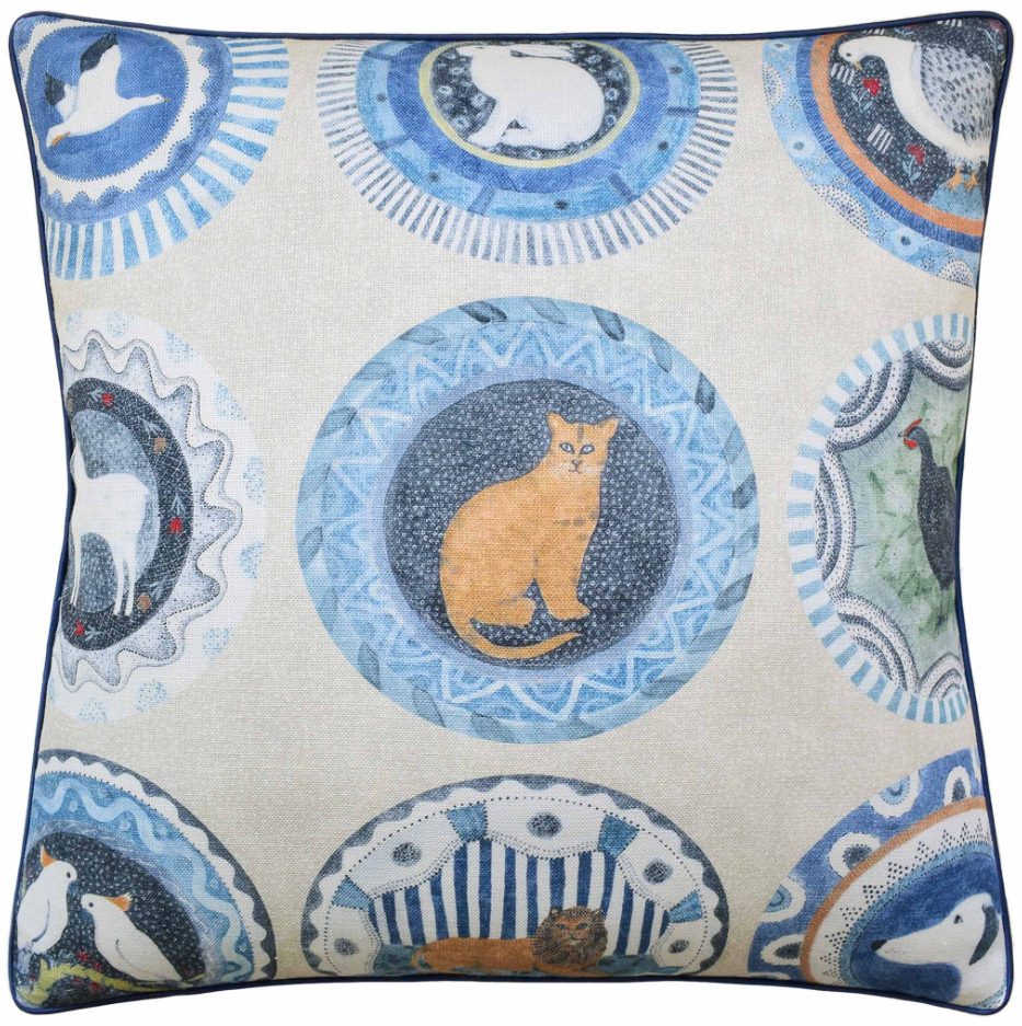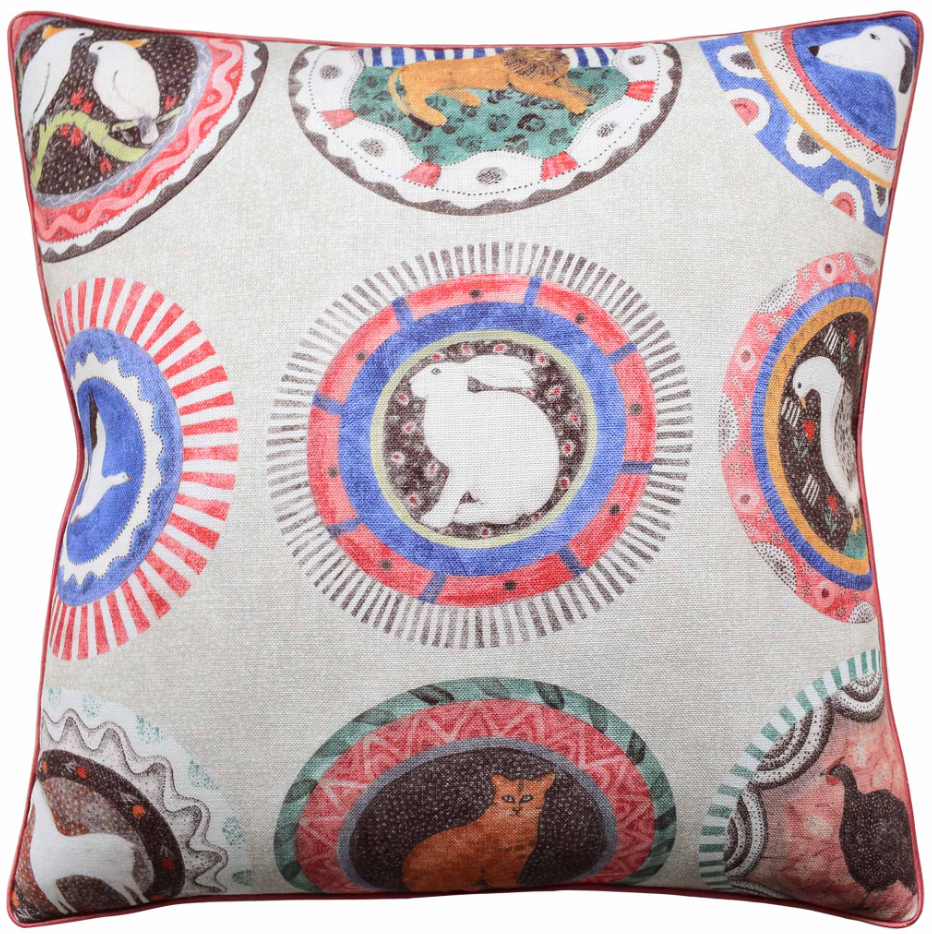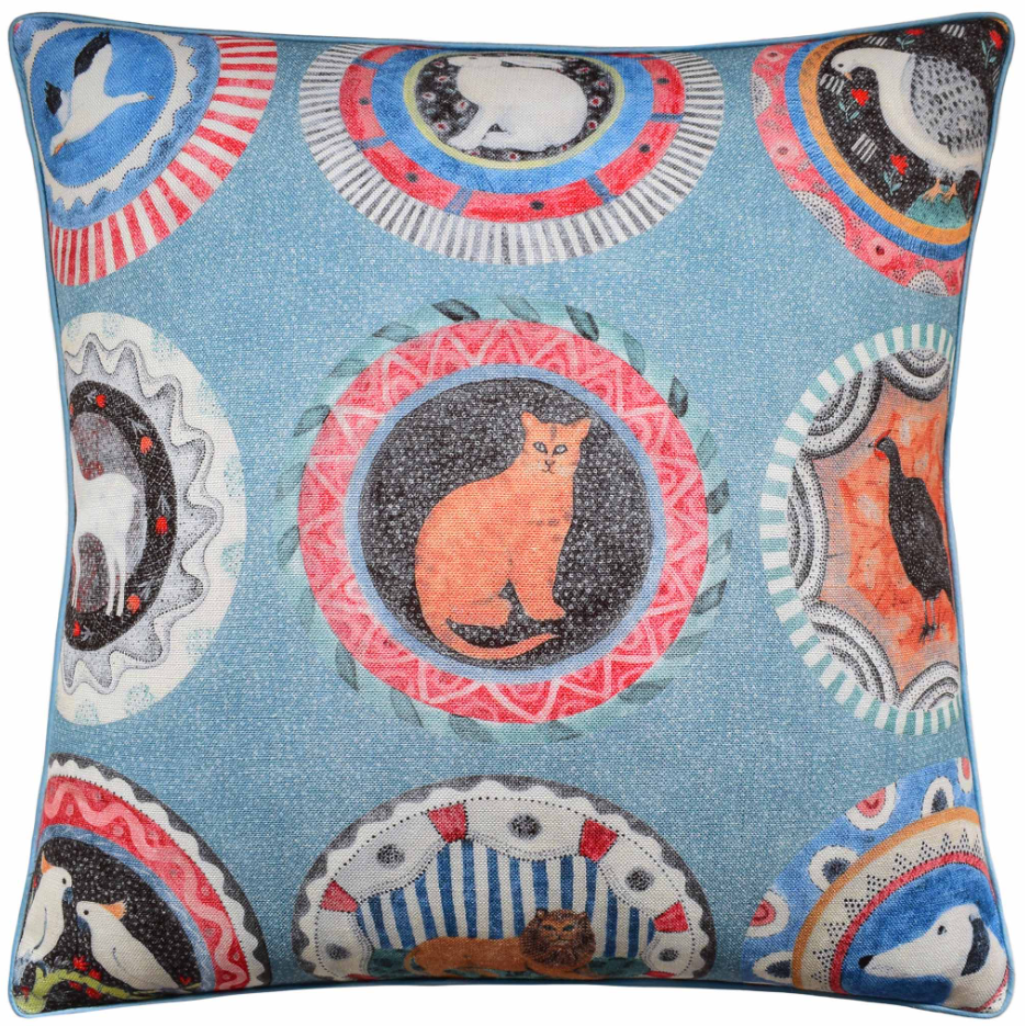 Robina's Dinner Party Pillows are a celebration of ceramicists, Robina Jack and depicts her glorious hand painted plates. These whimsical ceramics feature colourful wildlife and naïve patterns in a magnificent collective. These pillows are a novel way to show your playful side. Each features a center medallion depicting one of nature's creatures; cat, white rabbit or lion are available in (4) four unique combinations. Colorways include Blue, Cocoa Brown, Green, "Jewel" or Teal. Feature one or all of them! Cover is backed in solid Linen with contrast piping and has a zipper fora cleaning. Includes a down / feather insert.