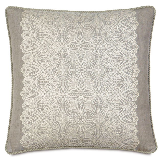 This elegant pillow combines delicate lace with soft 100% linen for a refined look. It reverses to a clean white side and features a classic cord edge. Includes your choice of insert and a zipper for easy cleaning. Perfect to enhance any room with subtle sophistication.