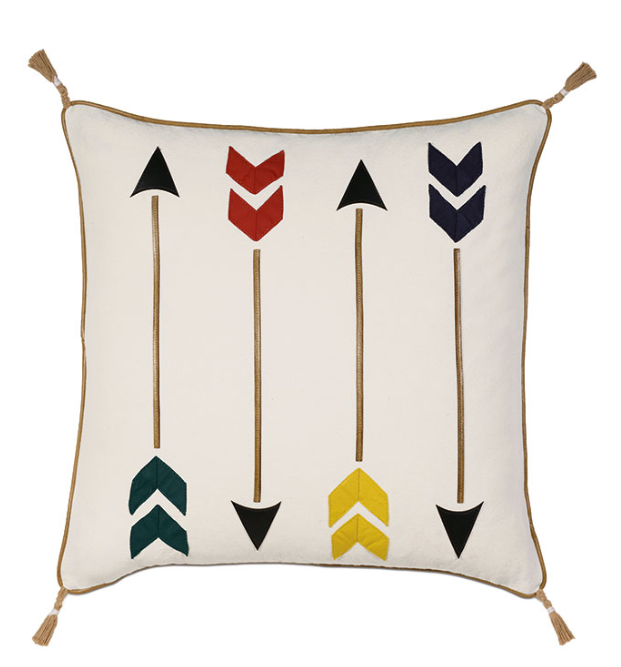 This decorative pillow showcases a modern laser-cut arrow design with a clean self-backed finish and mini welt edge. It includes corner tassels, your choice of insert, and a zipper closure for easy cleaning.