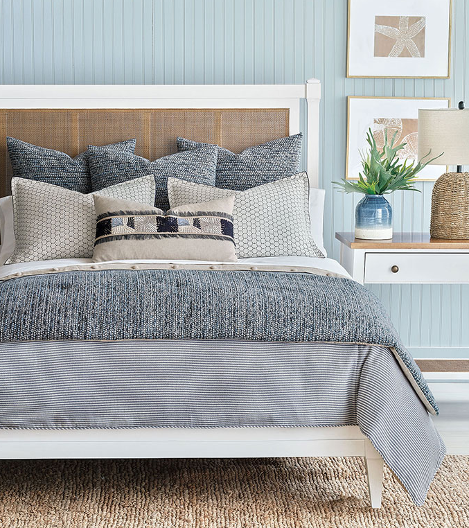 The Beau Bedset is crafted from a luxurious blend of materials that balance sophistication with comfort. The collection features a mix of finely woven linens and cottons, providing a soft, breathable foundation with a subtle, elegant texture. Decorative elements such as velvet accents and tailored trims add richness and dimension, while high-quality inserts and hidden closures ensure a polished, durable finish. The result is a refined, layered look that feels as inviting as it appears stylish. Made to Order- 4-6 weeks