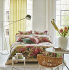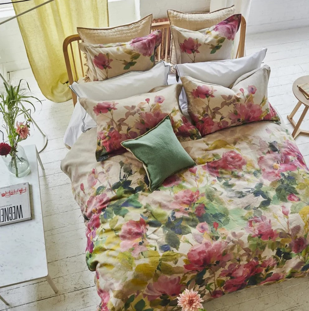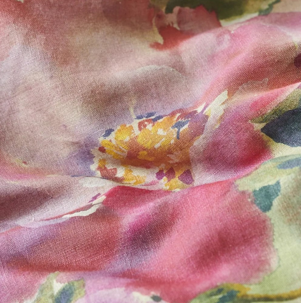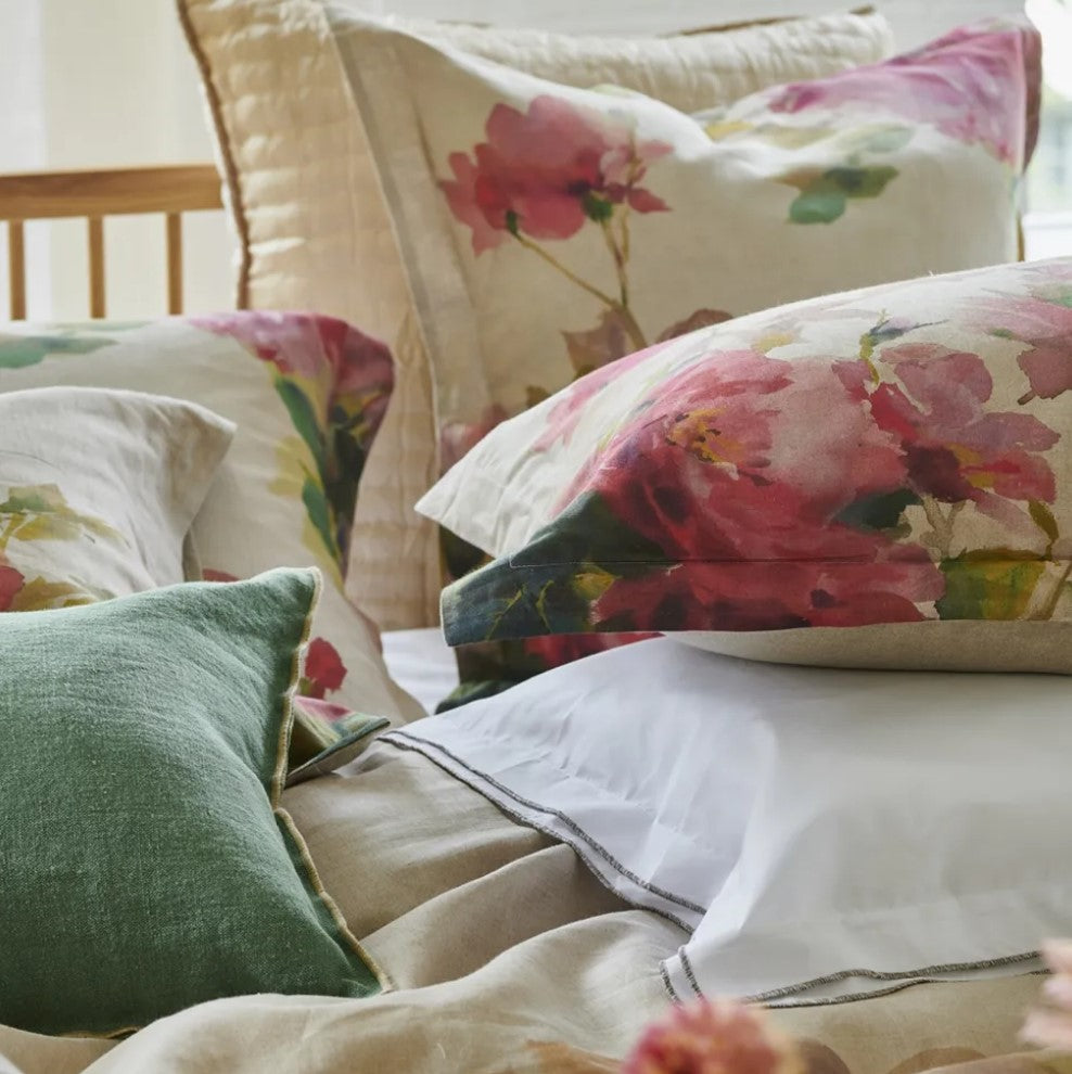 Reminiscent of an English country garden, the pure linen floral bedding of Thelma's Garden displays bouquets of painterly wild roses and peonies in soft water color tones. Digitally printed onto a luxurious natural linen with plain linen reverse. Shams finished with a smart linen color trim detail. Available in two sizes. Insert not included