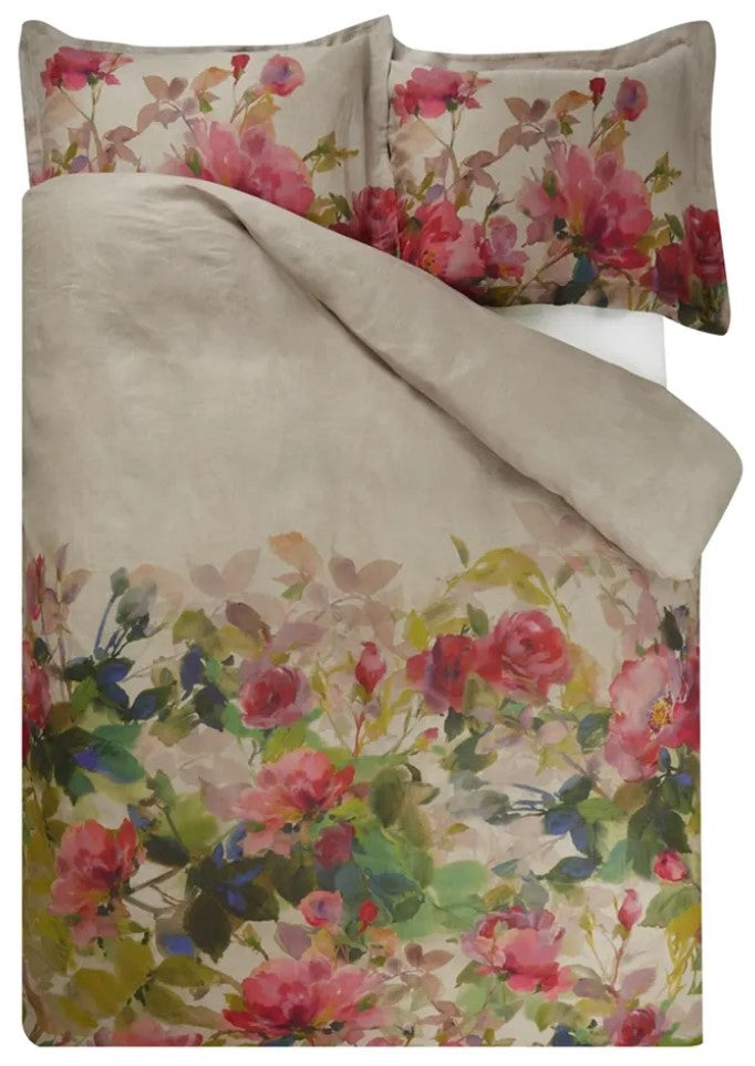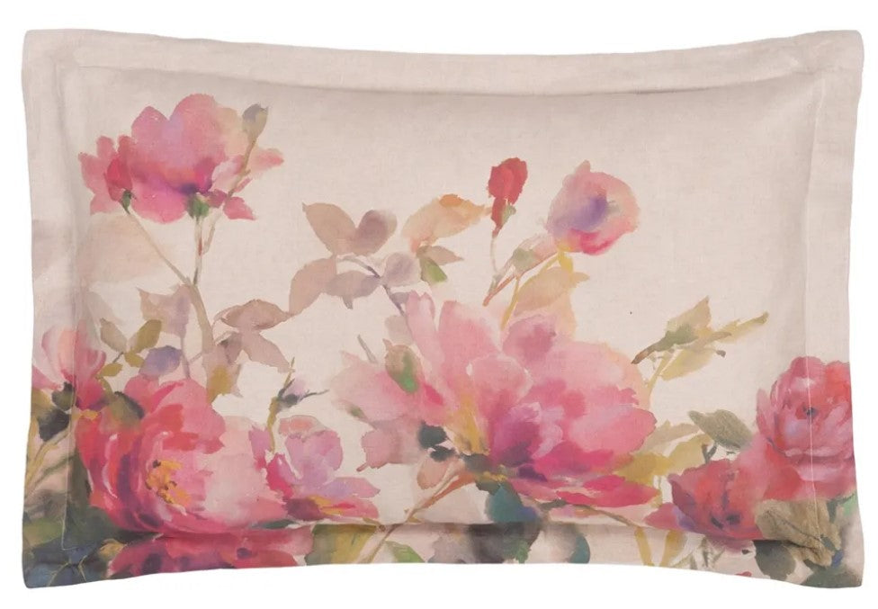 Reminiscent of an English country garden, the pure linen floral bedding of Thelma's Garden Shams displays bouquets of painterly wild roses and peonies in soft water colour tones. This maximalist design is digitally printed onto a luxurious natural linen with plain linen reverse. Shams finished with a smart linen color trim detail. Available in 4 sizes. Sold as a set of 2. Inserts not included