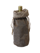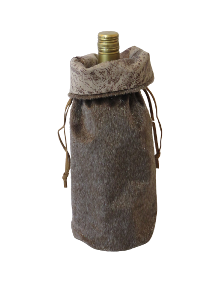 Festive brown faux fur wine bag with leather drawstring tie. Great for adding a little lux to your screw-cap wine