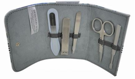 Designer's Guild Amrapali floral 5 piece Manicure wallet Set contains stainless steel cuticle remover, scissors, tweezers, nail clippers and a glass emery board in a pretty little package. Great as a gift or for travel.