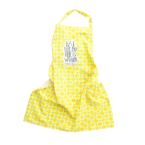 "Eat like no one is watching...or dance, whatever" Live your best life. This inspiring apron features words to live by and a sunny vibrant yellow diamond print with accents of minty green. Also featured a large pocket & cotton strap. Cook what you want. No one but this apron is watching—and it won’t tell a soul. This apron can be your daily ballgown or your secret superhero costume. Either way, in this, you’re one in a million.