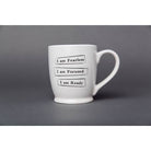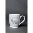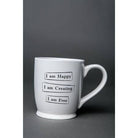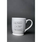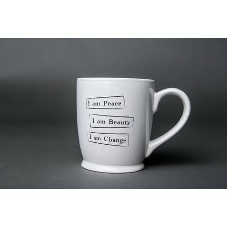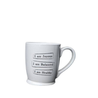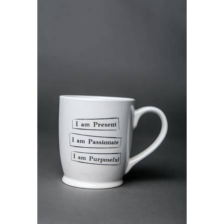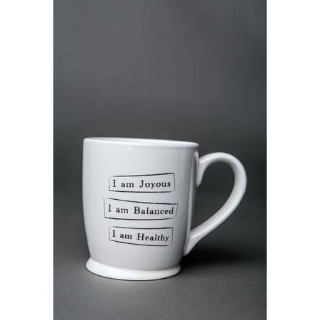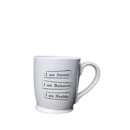 Start the day on the right foot. Drink your favorite morning beverage with an positive affirmation. The Affirmation Coffee Mug is white ceramic with Black lettering. Each mug includes 1 of your choices of 3-line affirmation / manta. Sold individually