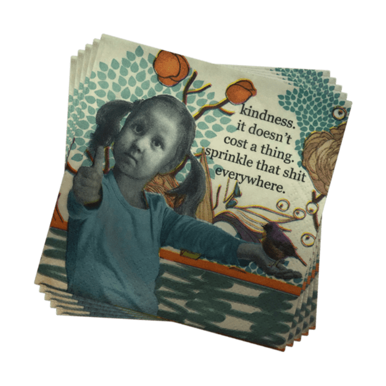 Another great design from artist and author Erin Smith. Erin is an adamant believer that truth is far stranger than fiction, and has combined her love of words with her love of art in these 'tell it how it really is' collages of a slice of life. These witty beverage napkins will be a hit with all your friends. (and the photos of actual images from Erin's family!)