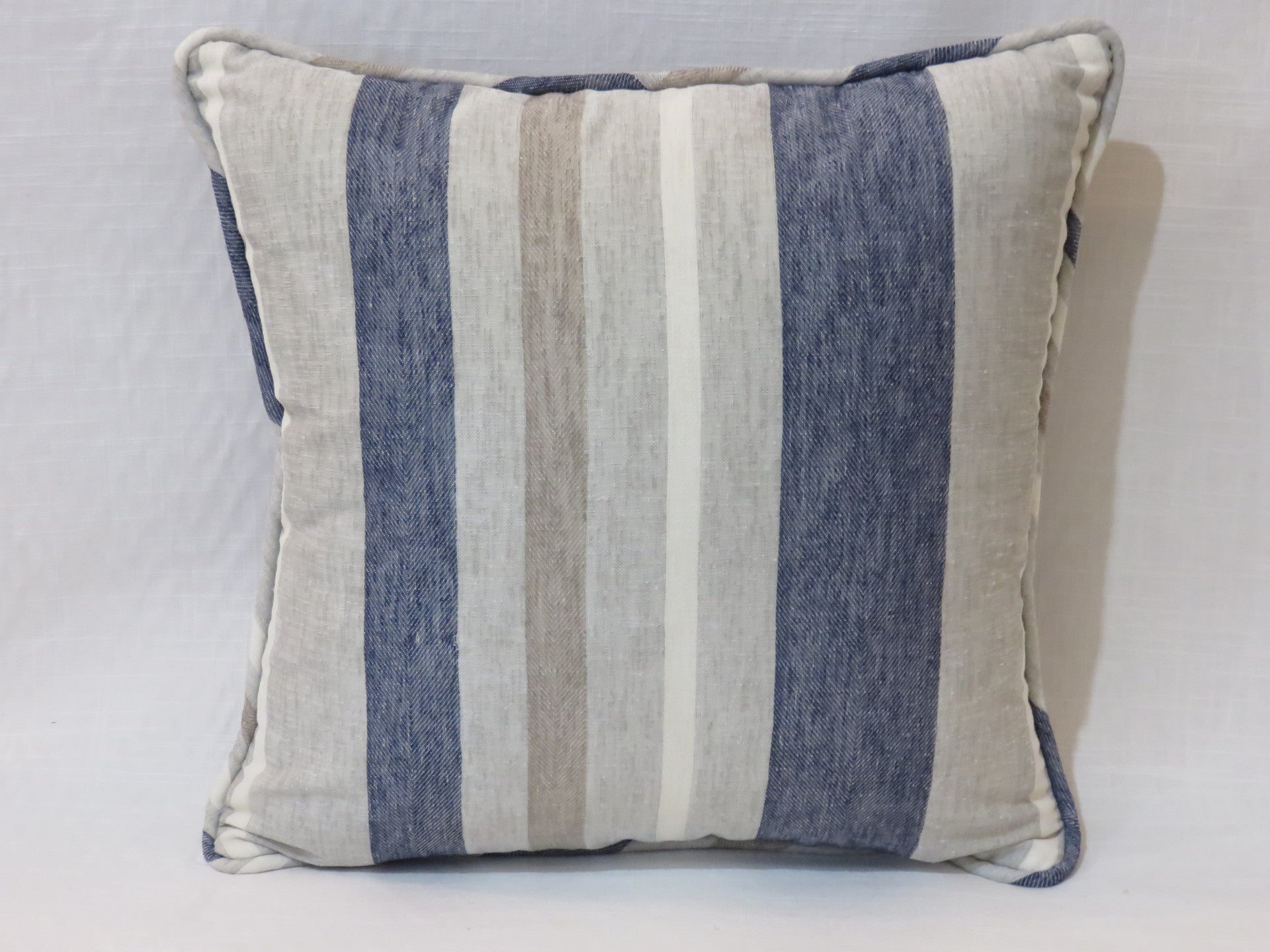 Custom Nautical Stripe Pillow Cover in Denim blue, white cotton duck; reverse to solid blue. Self Welt.