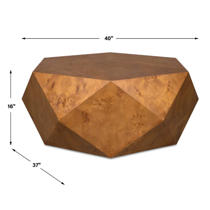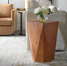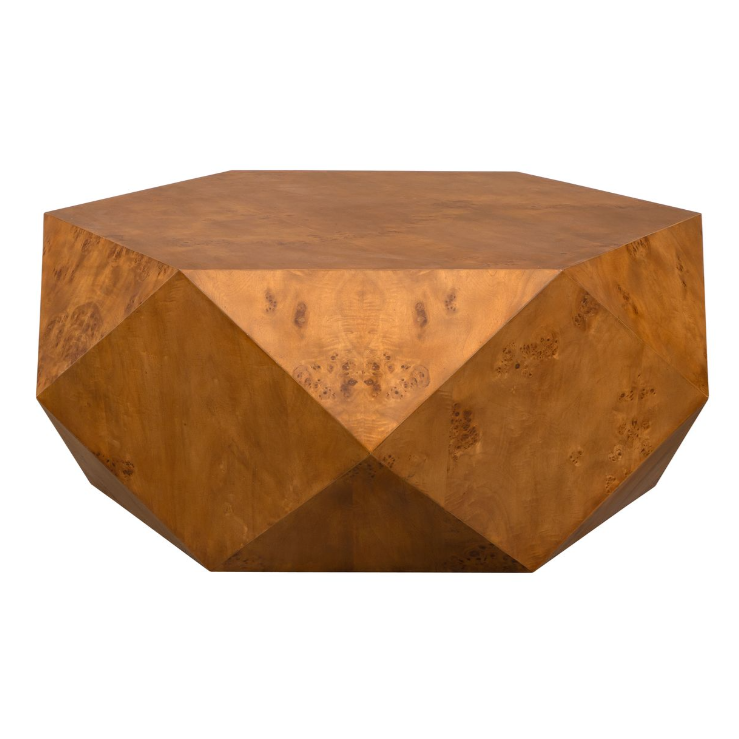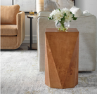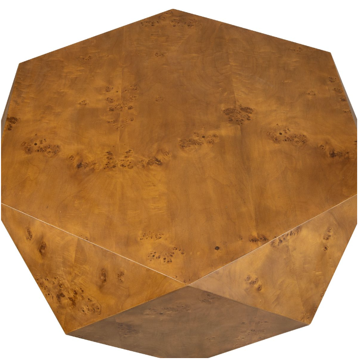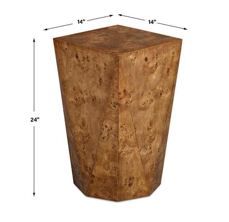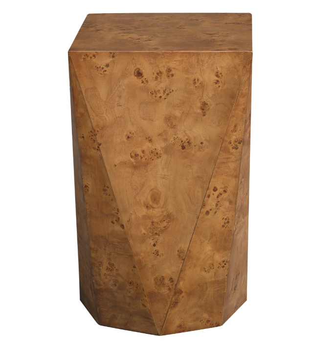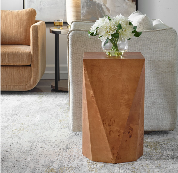 The Hughes Accent Table is unique geometric table boasts a sleek, geometric design that enhances both versatility and comfort. It is finished in a warm, caramel-toned poplar burl veneer.