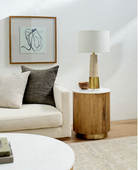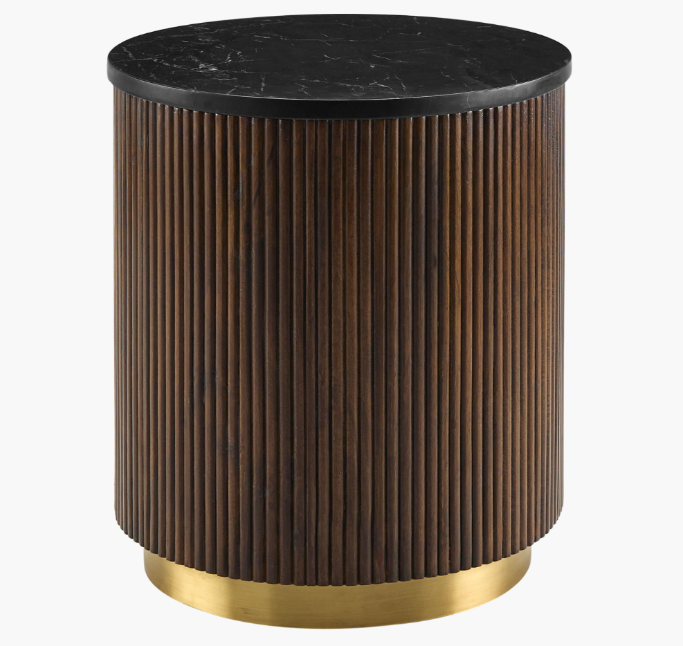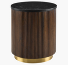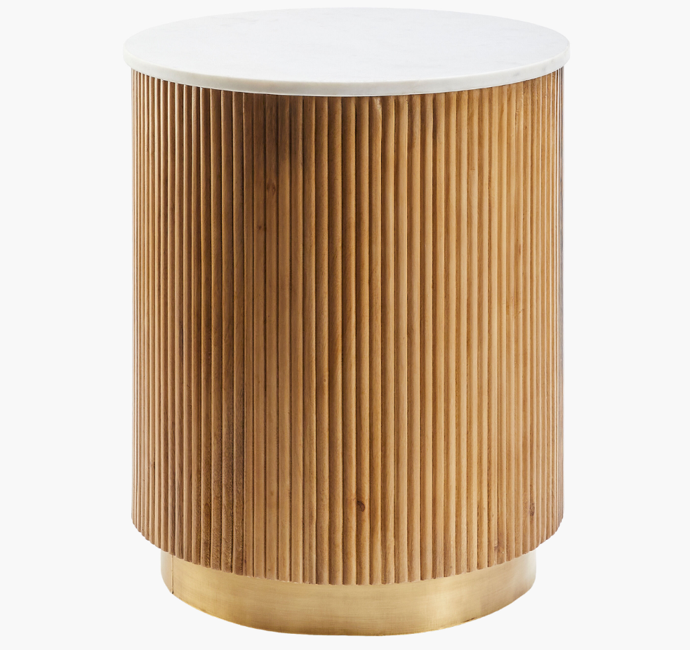 Introducing the Nems Side Table - a unique blend of drum shape, fluted mango-wood, and a stunning marble top. Choose from a light natural finish with white marble or a dark brown stained mango wood with black marble. Both options feature an inset brushed brass base for a touch of elegance.