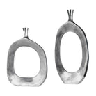 Cast of aluminum, the Cierra Handmade Metal Floor Vase Set is oversized to make a striking statement in an entry, on a mantle or hearth or anywhere you want to make a bold sculptural statement. Set of 2 is rich with texture and featured in a nickel finish.