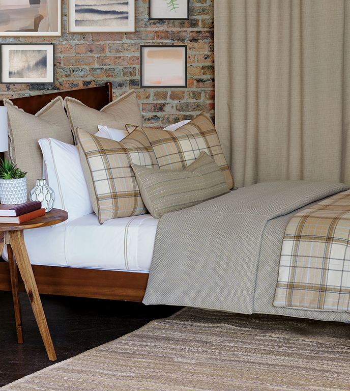 The Aldrich Bedding set is made from a refined blend of materials that emphasize both comfort and classic elegance. It features a combination of smooth cottons and textured linens, offering a soft hand feel with a tailored look. Subtle woven patterns and coordinating fabrics add depth and dimension, while the use of high-quality, durable materials ensures long-lasting style. Finished with fine details like contrast piping and decorative trims.
