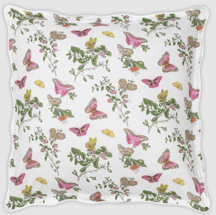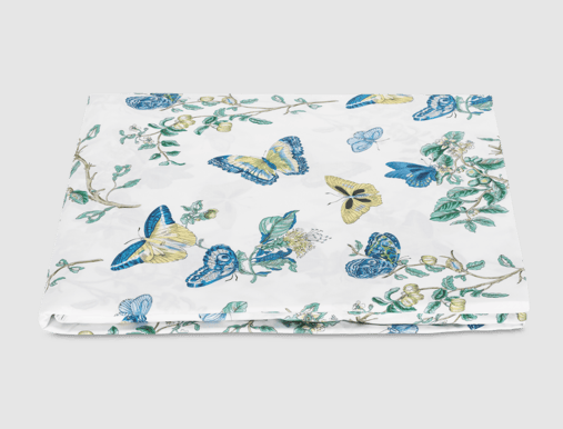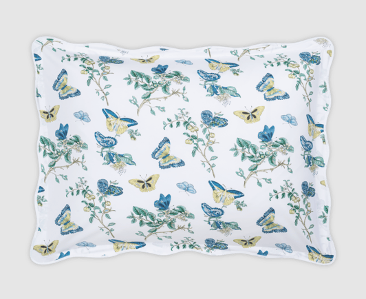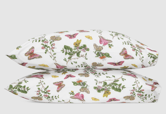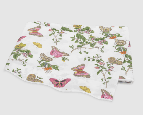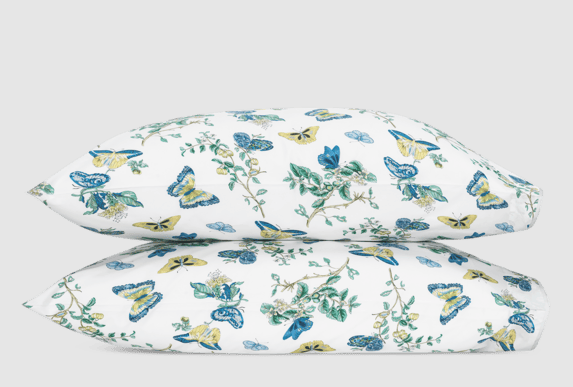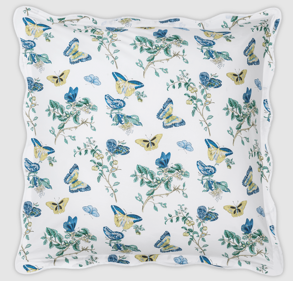 Transform your bedroom into a whimsical garden sanctuary with the Baudin Butterfly Sheets & Shams. This enchanting Schumacher design brings nature indoors with a charming mix of fluttering butterflies and lush botanical elements set against a crisp white background. Key pieces (shams & flat sheets) are finished with delicate scalloped trim that adds a touch of vintage-inspired elegance to your bedding ensemble. Perfect for those who appreciate fine linens with personality. Whether you're refreshing your bedroom or creating a bedroom that guests will adore, the Baudin collection offers a sophisticated yet playful approach to everyday luxury.