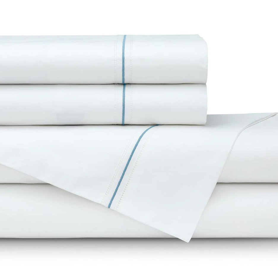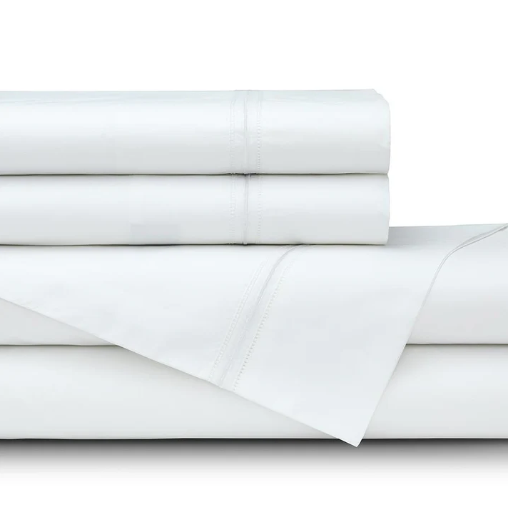 Bella White 300CT Sheet Set has a double hemstitch in white cotton percale with a satin piping embroidery. Includes one flat sheet, one 18" deep fitted sheet, and two pillowcases.