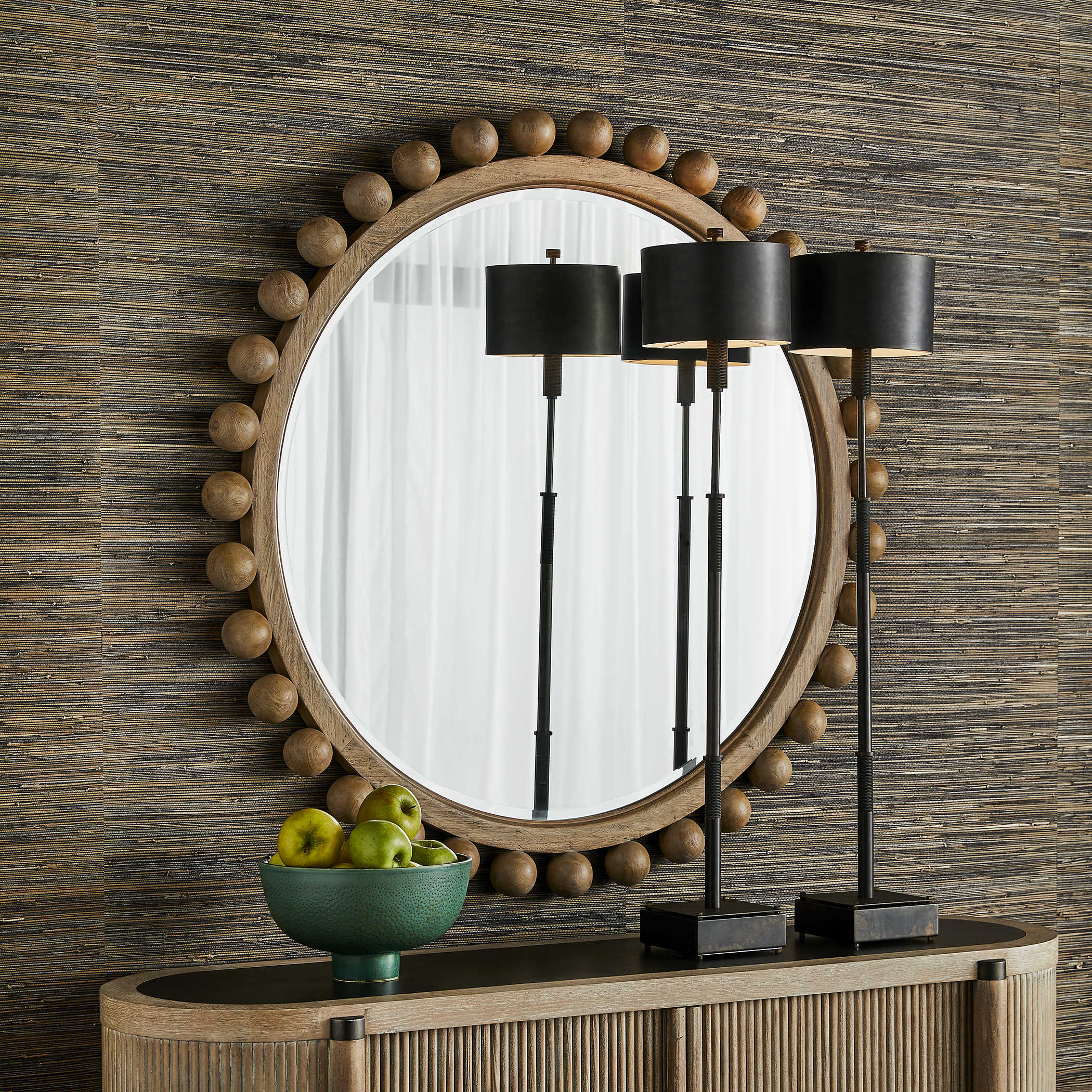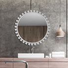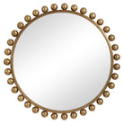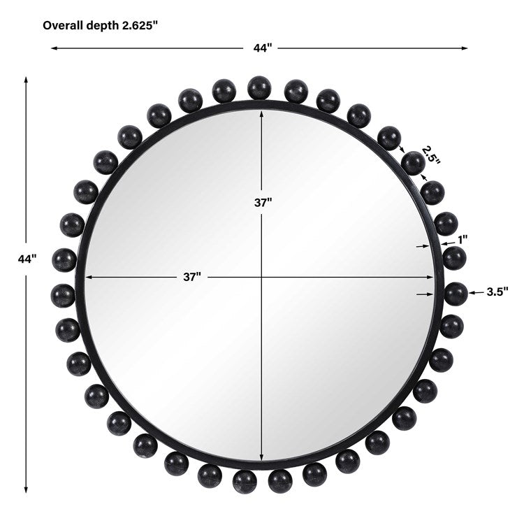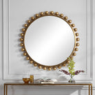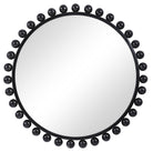 The eye-catching Cyra round mirror adds an upscale look and sophisticated style to any room by showcasing smooth iron spheres encircling a sleek inner frame. It's a timeless and chic accessory that adds a touch of both vintage glamour and modern elegance. Invite a little radiance into your home in 4 finishes and 2 sizes. Includes mounting hardware.