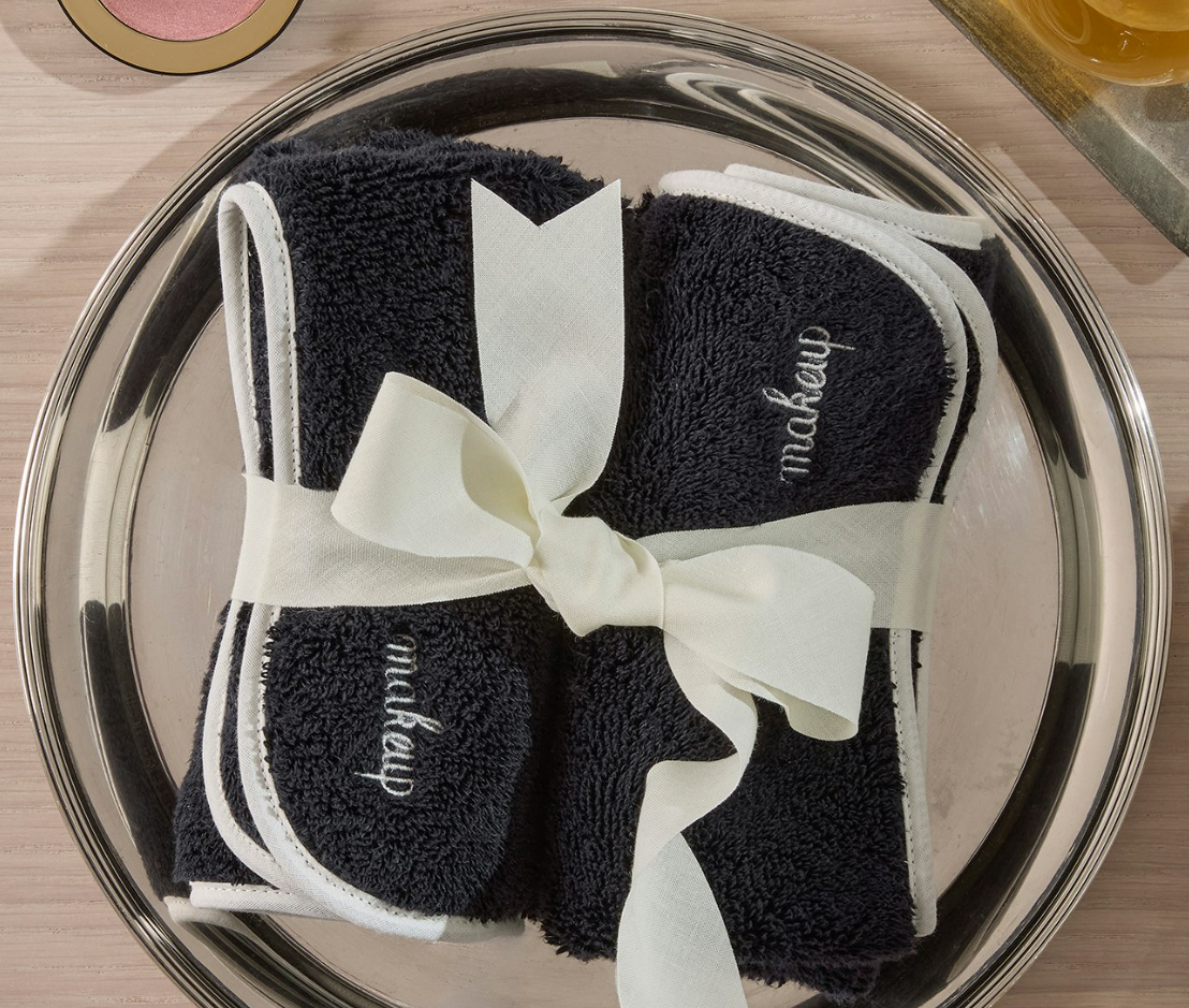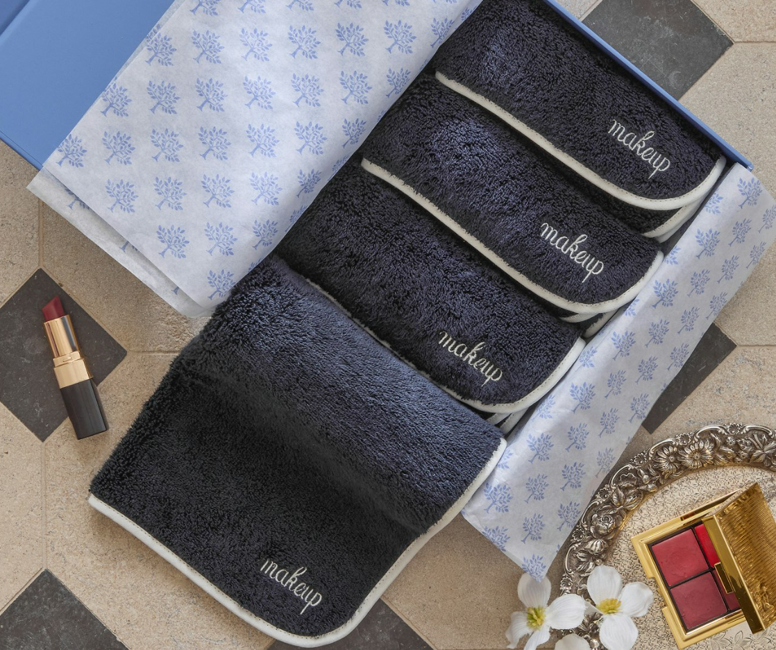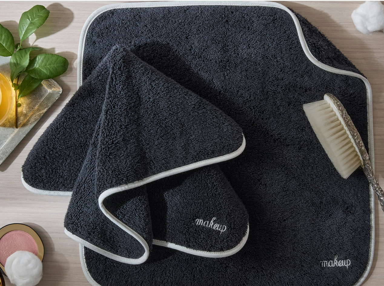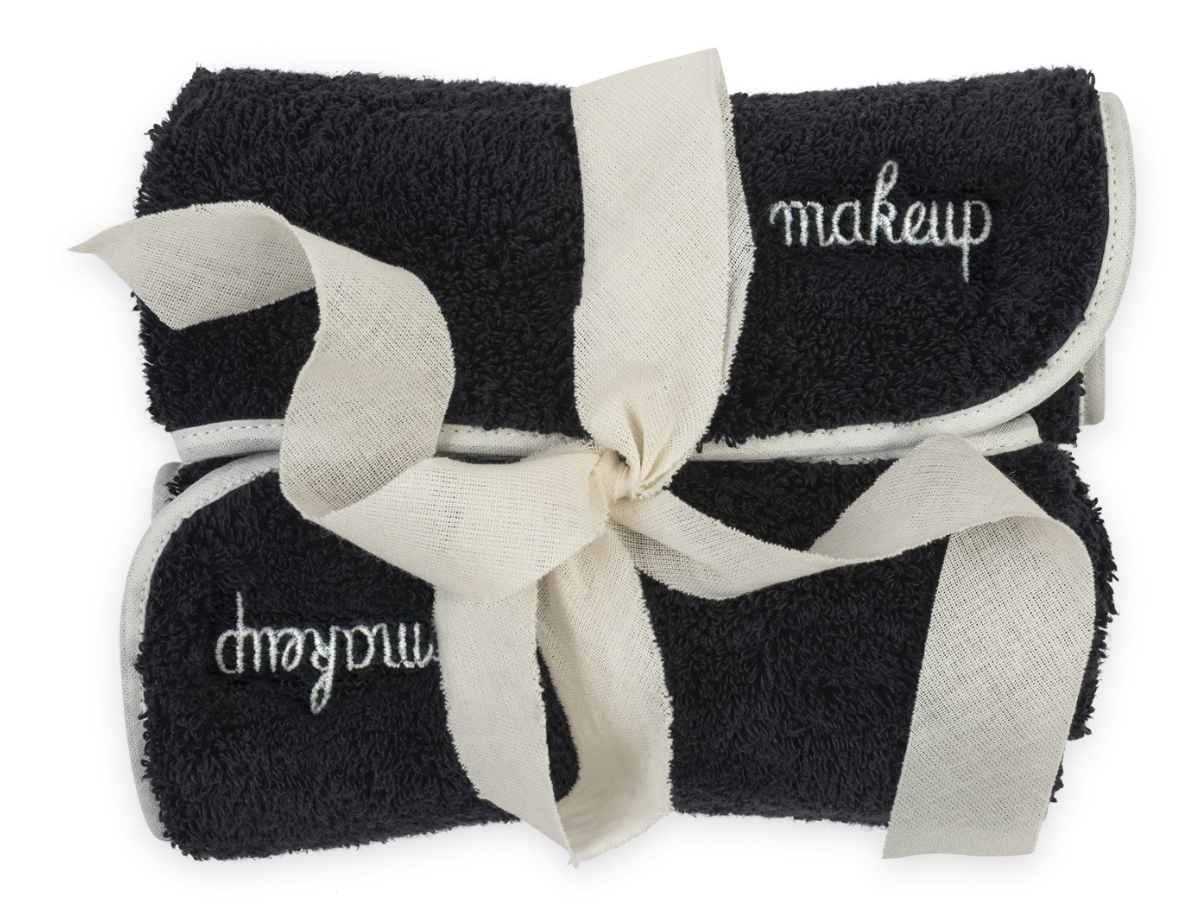 The Giza Makeup Towel is crafted from premium Giza cotton, known for its exceptional softness. Its vivid Carbon black color is designed to resist fading from light, chemicals and frequent washing, retaining its rich hue over time. It's embroidered with "makeup" in a custom font. Sold in a Set of 2 or a Set of 4 (with gift box). Carbon & White embroidery only.