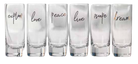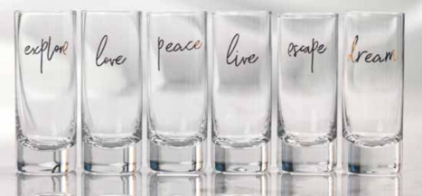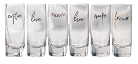 Set of 6 Assorted "Dream" Shot Glasses w/ script gilded words in either silver or gold script with one each of the below inspirational words. Makes a great host gift and will help your guests identify their glass